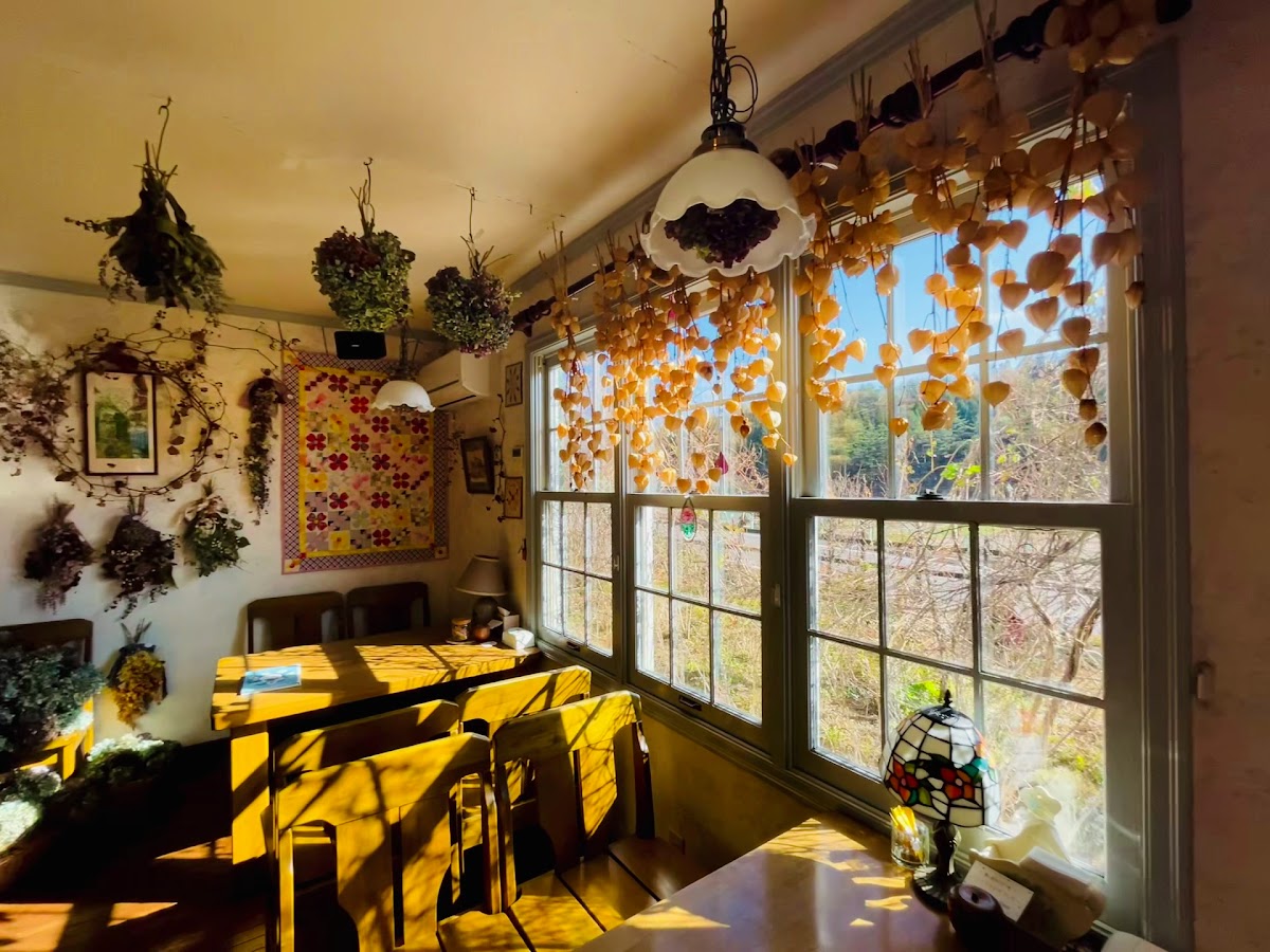 Step inside, and you'll be greeted by a warm ambiance filled with beautiful dry flowers, wreaths, and cozy quilts that create an inviting and whimsical environment. This is more than just a cafe—it's a serene retreat where the chatter of the outside world fades away, allowing you to indulge in the peaceful surroundings while enjoying a cup of something truly special.